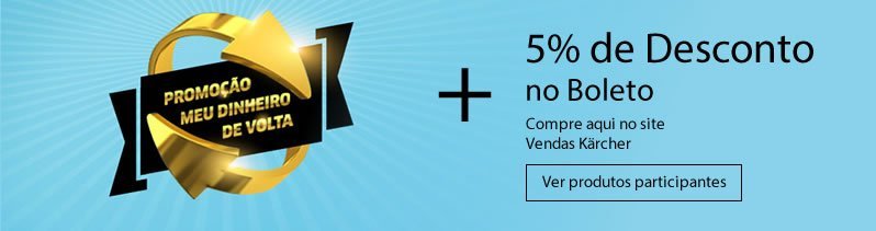 Promoção Meu Dinheiro de Volta KärcherQuer ajudar o meio ambiente e também o seu bolso? Na compra de uma lavadora de alta pressão da linha K2, K3 K4 ou K5 você recebe até R$ 100,00 de volta. Você economiza na hora da limpeza com as lavadoras a jato Kärcher. Cada equipamento de limpeza Kärcher participante da promoção possui um valor diferente.Confira quanto você recebe de volta na compra da sua lavadora Kärcher para o lar - Na compra dos modelos K2 Standard Jardim; K2 500; K2 500 Black e K2 500 Kit Reuso receba R$ 40,00 de volta. Se você comprou uma lavadora da Kärcher e quer receber o valor da promoção, é necessário se cadastrar no site da promoção, utilizando seus dados pesoais e os dados do produto que você comprou aqui na Vendas Kärcher. Para participar sua compra deve ter sido realizada entre 15 de Julho ao dia 15 de Setembro de 2015. Você deve scanear a nota fiscal no momento do cadastro no site. A Kärcher tem uma equipe trabalhando apenas com a checagem das informações. Depois disso é só aguardar para que o seu dinheiro seja depositado na sua conta bancária. Para saber mais sobre a Promoção Meu Dinheiro de Volta Kärcher acesse o seu site em www.karcher.com.br/meudinheirodevolta. Compre lavadoras de alta pressão Kärcher com o melhor preço aqui na loja Vendas Kärcher |